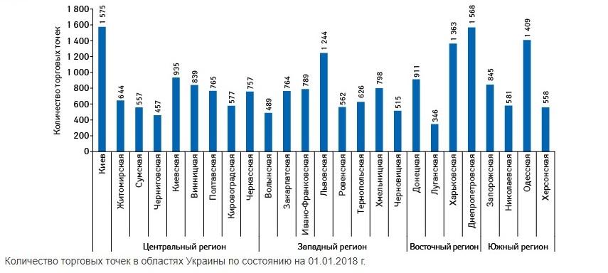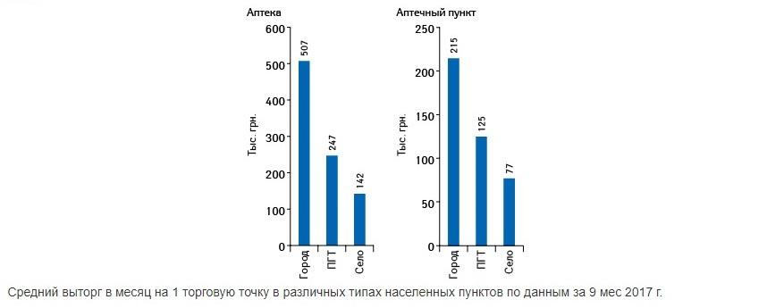 Больше всего аптек и аптечных пунктов в Днепропетровской, Одесской, Харьковской и Львовской областях. В Киеве, представленном как самостоятельная административная единица, работает 1 600 торговых точек, или 7,7% от общего объема по Украине.