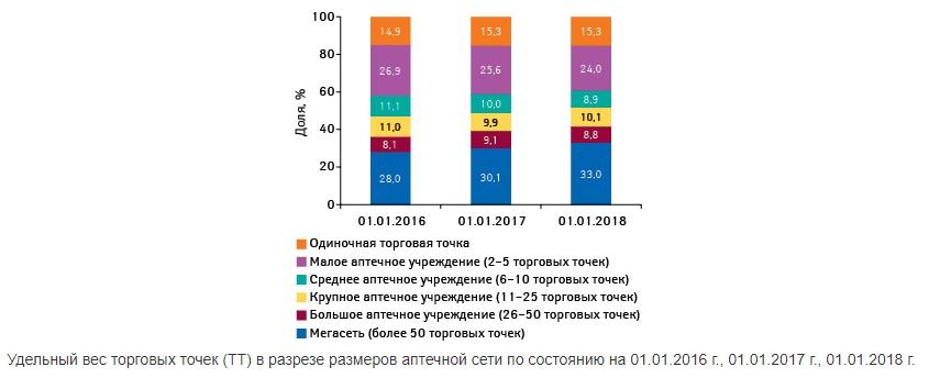 Вследствие консолидации розничного сегмента удельный вес небольших аптечных предприятий (имеющих в своем составе до 10 торговых точек) сокращается. Тем не менее они все еще аккумулируют около половины всех розничных торговых точек. Около 20% принадлежат крупным (11–25 торговых точек) и большим (26–50 торговых точек) аптечным сетям. Важно отметить, что доля мегасетей (в составе которых насчитывается более 50 торговых точек) активно возрастает. Так, за последние три года количество торговых точек, принадлежащих мегасетям, увеличилось более чем на тысячу, а их удельный вес в инфраструктуре увеличился с 28 до 33%.