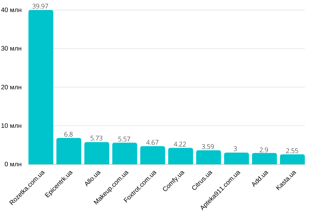 Редакция EVO.business проанализировала данные сервиса SimilarWeb и подготовила список самых посещаемых интернет-магазинов в Украине в июне 2020 года. Согласно рейтингу издания, помимо лидирующего с большим отрывом онлайн-ритейлера Rozetka, в топ-5 наиболее посещаемых интернет-площадок также вошли Epicentrk.ua, Allo.ua, Makeup.com.ua и Foxtrot.com.ua.