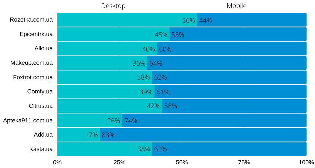Составители рейтинга также подготовили другую интересную информацию по самым посещаемым интернет-магазинам Украины. В частности – по источникам трафика в разрезе Desktop и Mobile. В EVO.business обращают внимание, что больше всего посещений с мобильного на сайты, которые продают лекарства — Apteka911.com.ua и Add.ua — 74% и 83% соответственно.