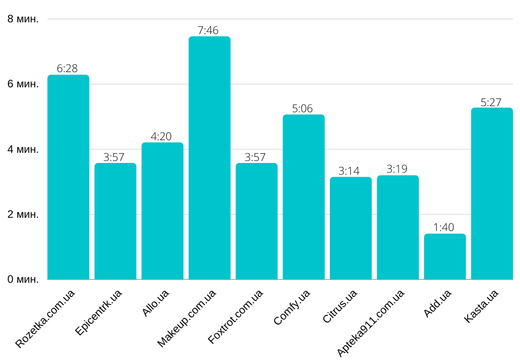 Что касается продолжительности сеанса, то больше всего времени пользователи проводили на сайте парфюмерно-косметического онлайн-ритейлера Makeup.com.ua — 7 минут 46 секунд. Меньше всего — на сайте Add.ua — 1 минуту 40 секунд.