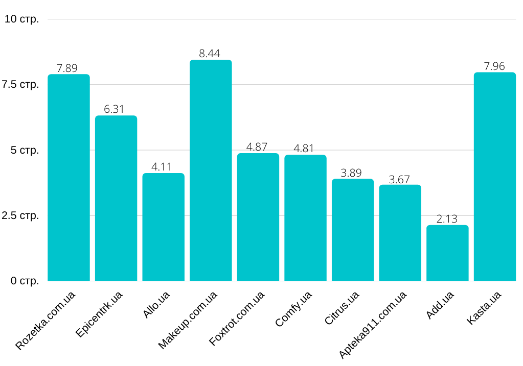 Лидером по количеству просмотров страниц за один раз также стал интернет-магазин Makeup.com.ua — 8. Меньше всего страниц за раз пользователи просматривали на сайте Add.ua — 2.