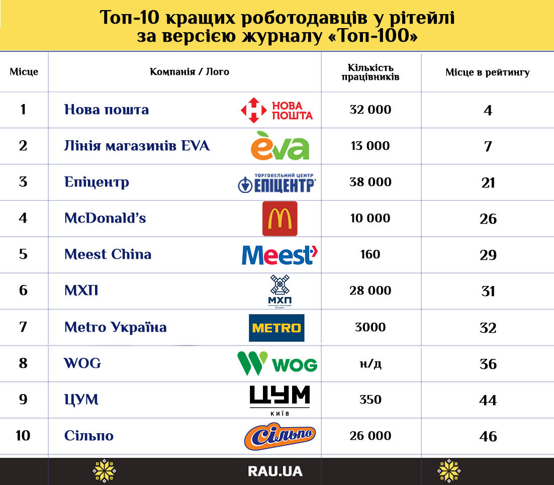 RAU выделила среди финалистов рейтинга десять лучших работодателей из сферы ритейла. Как видно из таблицы ниже, среди победителей есть две компании из сферы логистики (Нова пошта и Meest China), два продуктовых ритейлера (Metro Cash&Carry и Сільпо) и крупные игроки из других сфер ритейла. В частности, это самая большая drogerie-сеть в Украине EVA, сеть магазинов Эпицентр, крупнейшая сеть ресторанов быстрого питания McDonald’s и холдинг МХП, который сейчас переживает трансформацию в кулинарную компанию. Также в 50 лучших работодателей входят сеть АЗК WOG и киевский ЦУМ.