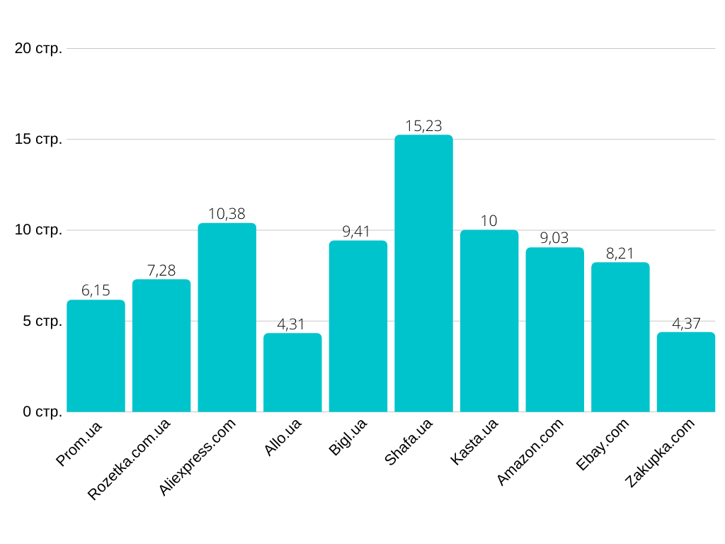 Больше всего страниц за раз пользователи просматривали на сайте Shafa.ua — 15. Это связано со спецификой маркетплейса — на нем люди не всегда ищут конкретный товар, а присматривают варианты доступных брендовых вещей.