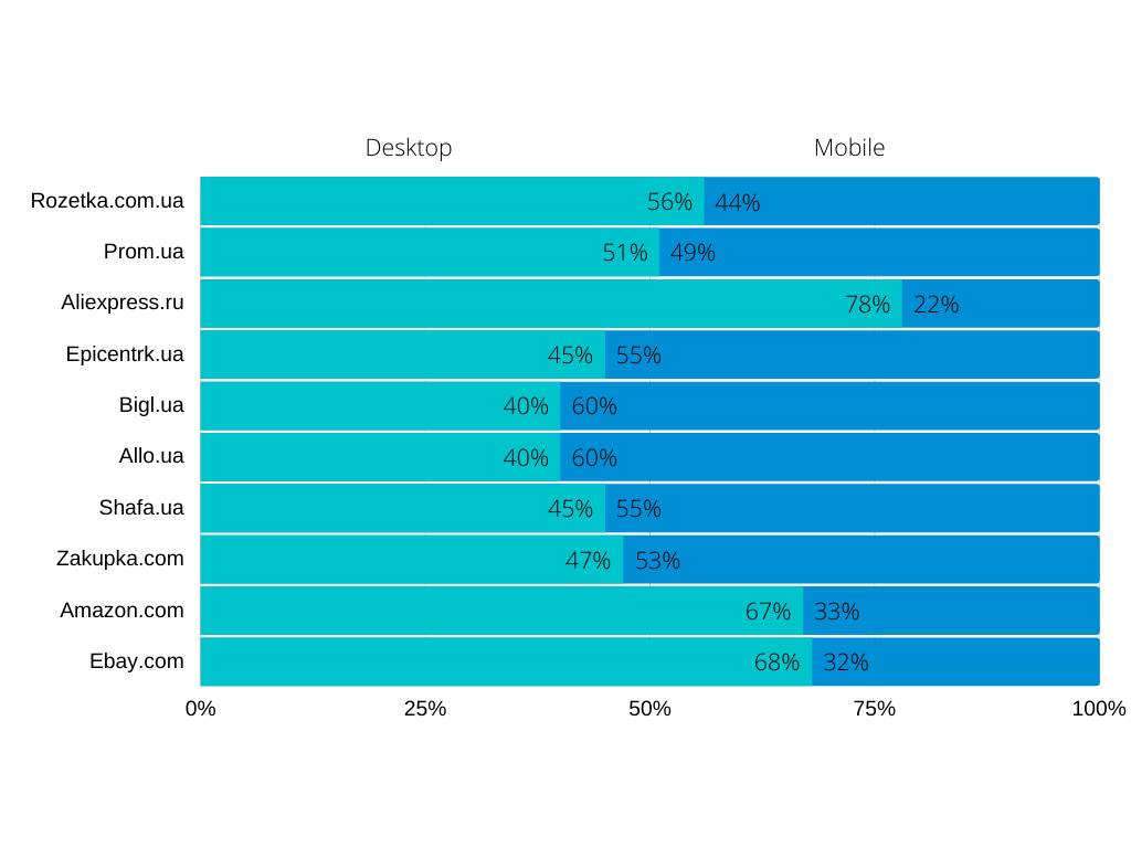 Также в EVO.business подготовили другую интересную информацию по самым посещаемым маркетплейсам в Украине. В частности — по источникам трафика в разрезе Desktop и Mobile. Как видно из диаграмм, украинские сайты посещают чаще с мобильного, в то время как зарубежные маркетплейсы – со стационарных устройств.