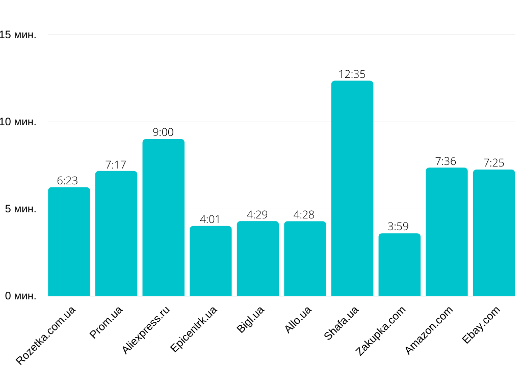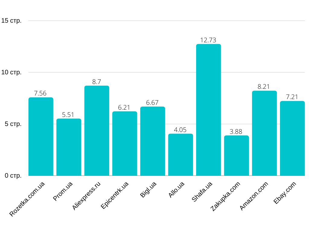 Лидером по количеству просмотров страниц — почти 13 страниц за один раз — также стал сайт Shafa.ua. Это связано со спецификой маркетплейса — на нем покупатели не всегда ищут конкретный товар, а присматривают варианты доступных брендовых вещей.
