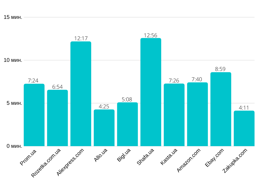 Больше всего времени пользователи проводили на сайте Shafa.ua и Aliexpress.com — почти 13 минут. Для сравнения: один сеанс на веб-версии Facebook в ноябре в среднем длился 11 минут. Быстрее всего клиенты выходили с Allo.ua и Zakupka.com — через 4 минуты.