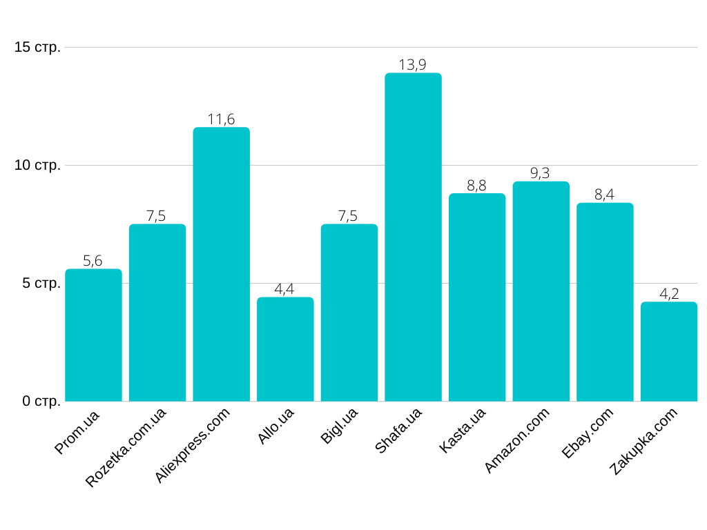 Рекордсмен по числу просмотренных за раз страниц — сайт Shafa.ua. Это связано со спецификой маркетплейса — на нем пользователи не всегда ищут конкретный товар, а присматривают варианты доступных брендовых вещей.