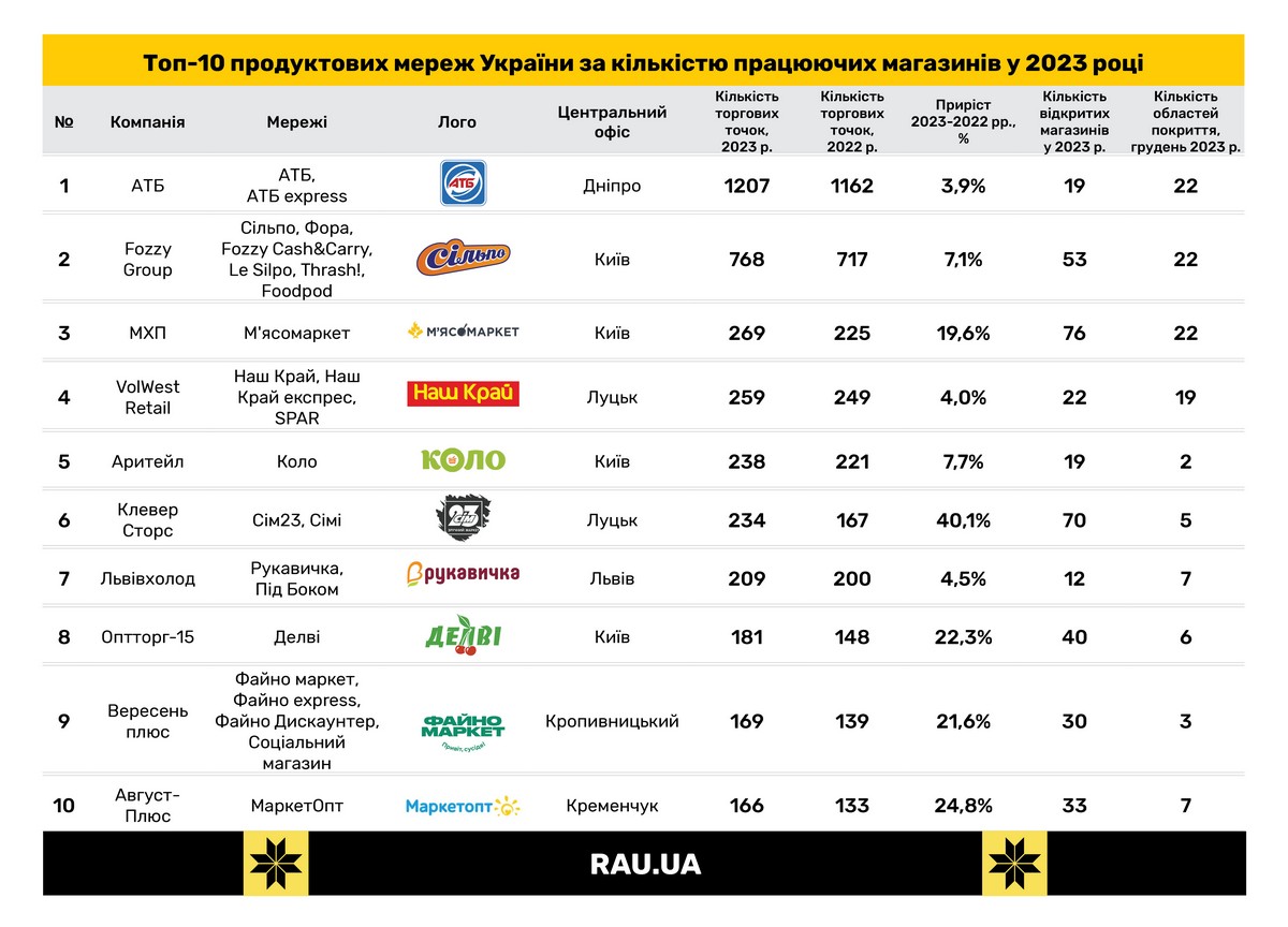 Топ-10 украинских продуктовых сетей по количеству магазинов и темпам открытий в 2023 году