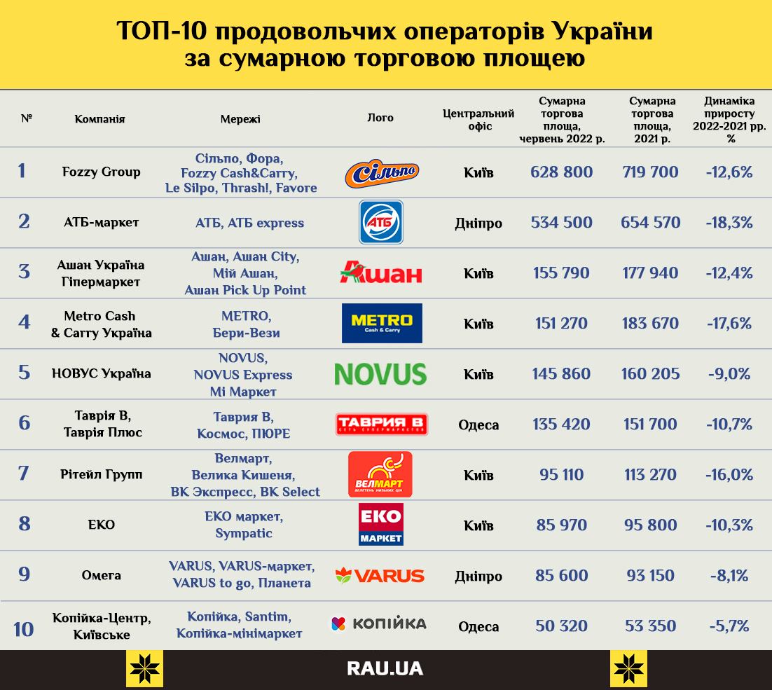 В частности, Fozzy Group, по-прежнему лидирующая в списке крупнейших по площади ритейлеров, сократила свои торговые площади на 12,6% или на 90 900 кв. м. Теперь общая торговая площадь всех магазинов Сільпо, Фора, Fozzy Cash&Carry, Le Silpo, Thrash! Траш!, Favore по состоянию на конец первого полугодия 2022 года составляет всего 628 800 кв. м. Это немного больше, чем было на конец 2020 года.