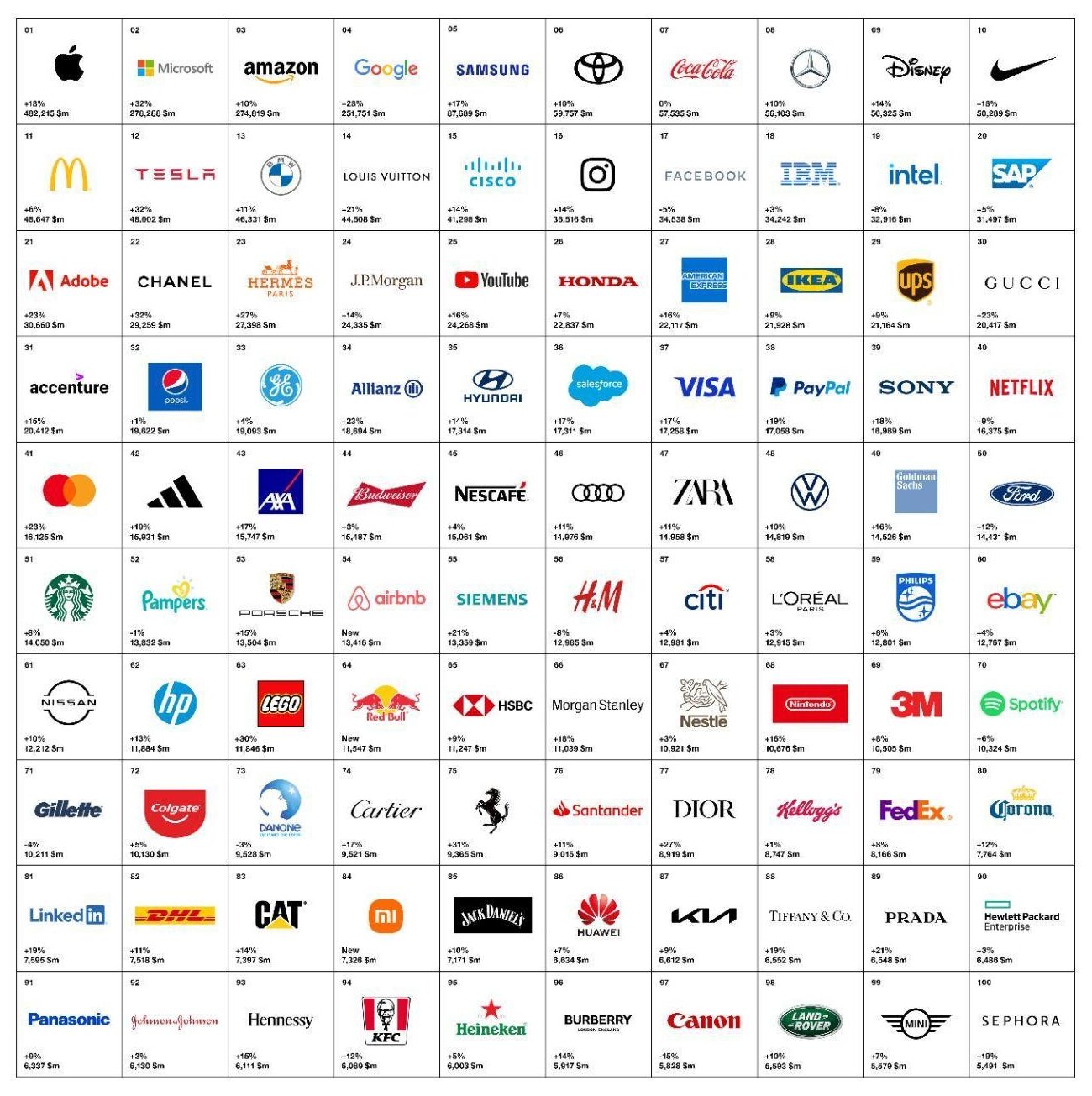 На втором месте оказалась Microsoft, обогнавшая Amazon и потеснившая интернет-гиганта на третье место. Microsoft наращивала стоимость своего бренда всю последнюю пятилетку (сначала обогнав Google), но в этом году компания показала наибольший темп роста (+32% до $278,3 млрд). Вместе с Microsoft аналогичные темпы показали только две компании: Tesla и Chanel.