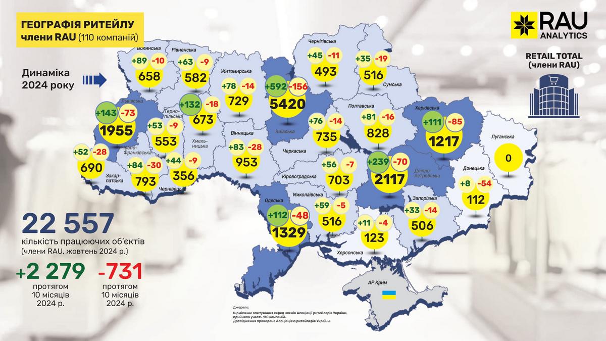 Как показал регулярный ежемесячный опрос RAU, проведенный среди 110 членов Ассоциации ритейлеров Украины, по состоянию на ноябрь 2024 года у них работало уже 22 557 торговых точек в восьми основных отраслях ритейла. Напомним, что до начала полномасштабного вторжения в Украину работало 17 396 магазинов.