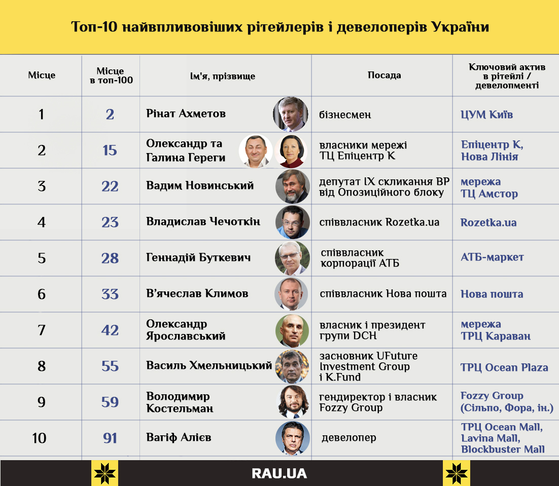 В рейтинге самых влиятельных украинцев присутствуют представители самых разных сфер жизни: политики и чиновники, спортсмены и писатели, духовенство и бизнесмены. Чтобы определить самых влиятельных из них, журналисты издания опросили 42 авторитетных эксперта из разных сфер общественной жизни: активистов, политологов, правозащитников и так далее. Именно они и определяли: кто из украинцев сильнее всего влияет на страну и общество. RAU выбрала из списка людей, прямо связанных с ритейлом или владеющих активами в торговой недвижимости или смежных отраслях.