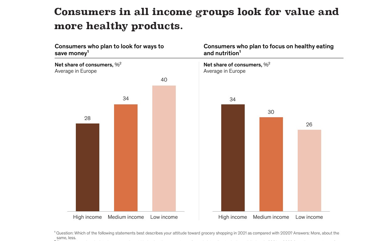Кризис COVID-19 ускорил тенденцию к производству более здоровых, экологически чистых и локальных продуктов. Примерно треть европейцев планируют уделять больше внимания здоровому питанию в 2021 году, а 24% планируют больше тратить на региональные и местные продукты. При этом 19% готовы больше тратить на экологически чистые продукты.