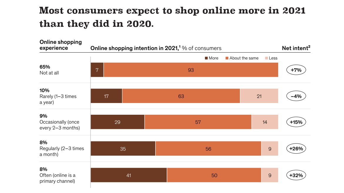 Чем чаще покупатели совершали приобретения онлайн, тем более охотно они готовы делать это в будущем. К примеру те, кто и раньше редко покупал продукты в интернете (10% всех потребителей), заявили, что они планируют сократить, а не увеличивать свои онлайн-расходы (-4%). Зато привычные к этому каналу покупок готовы нарастить траты на 32%.