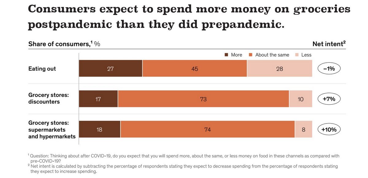 Однако опросы потребителей показывают, что привычка работать и готовить дома частично сохранит этот дополнительный драйвер роста. Так, от 7 до 10 % потребителей ожидают, что после пандемии потратят больше на продукты и меньше на питание вне дома, чем до пандемии.