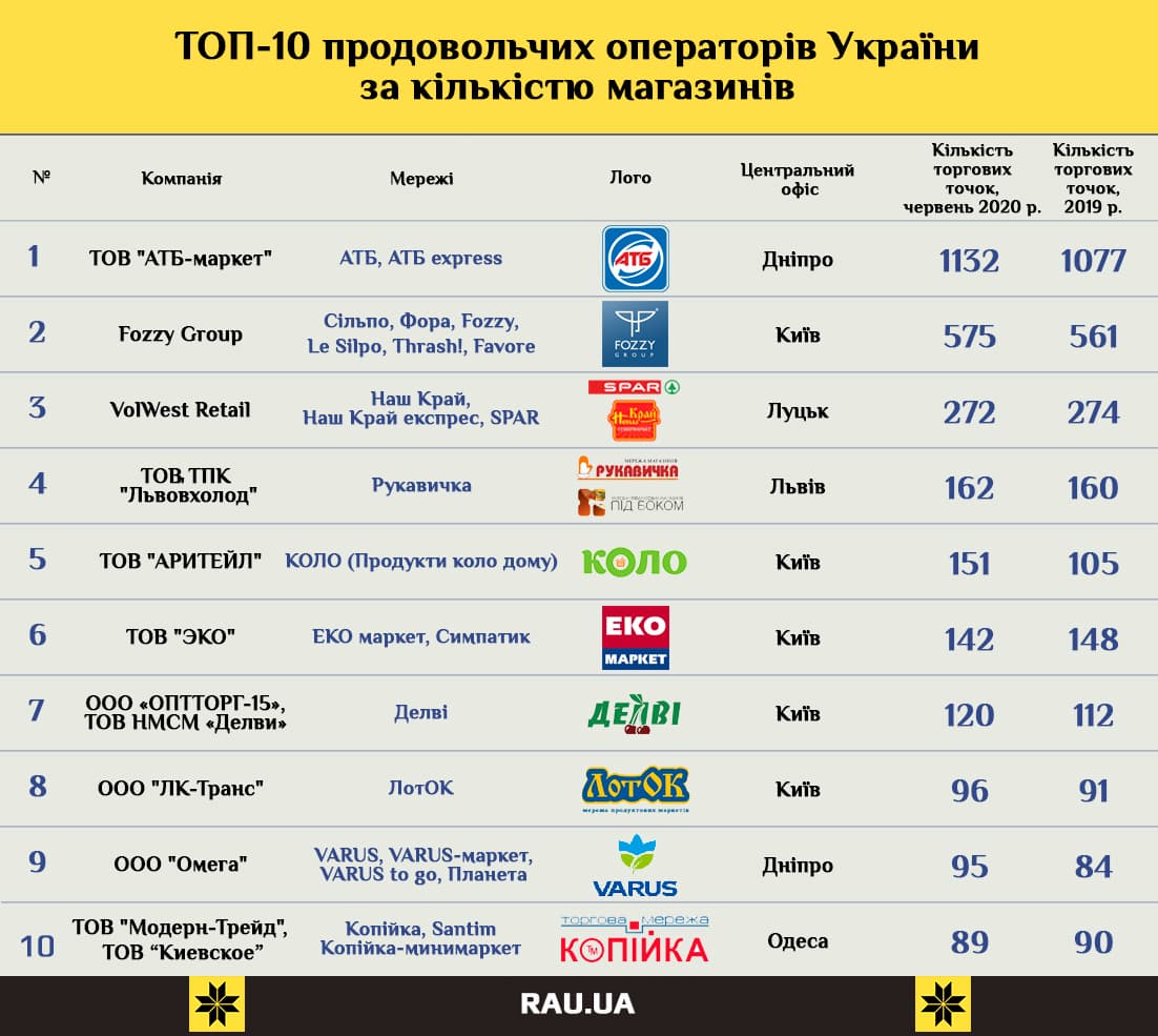 В топ-6 сетей по количеству открытых точек в первом полугодии 2020-го вошли: АТБ-маркет, КОЛО, Делви, Fozzy, Varus и Volwest Retail. В относительных показателях существенно нарастил свою сеть ритейлер из Днепра – Varus – сразу на 13,1%.