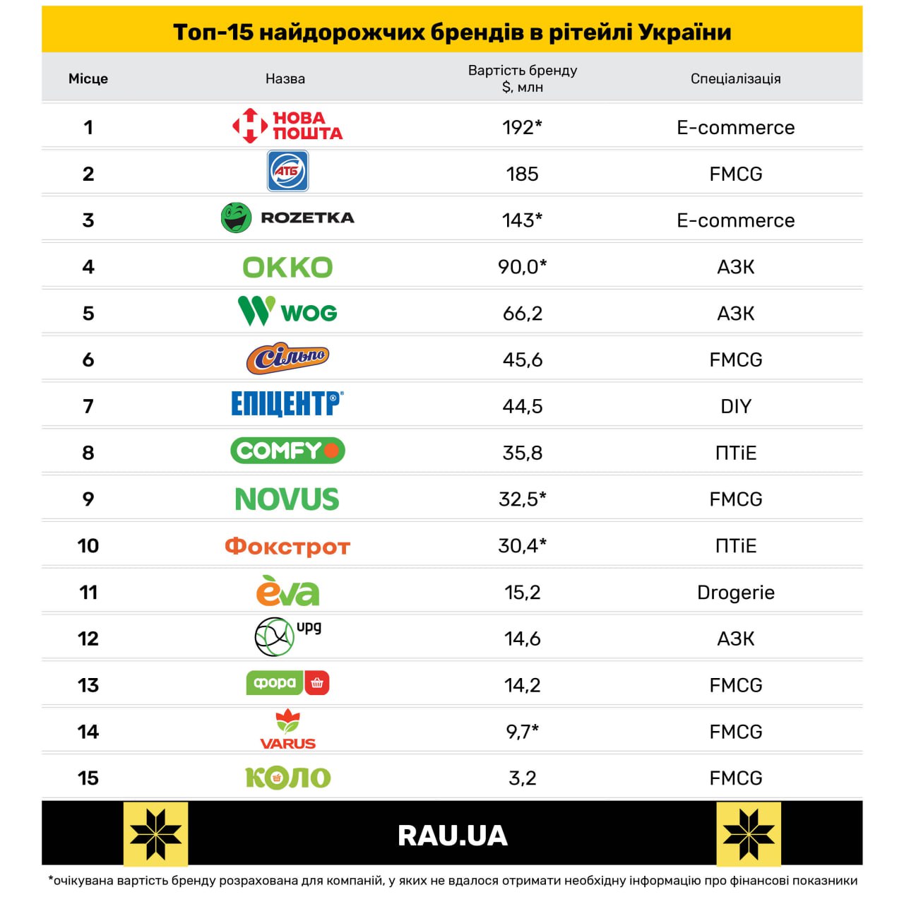 Общий список компаний по стоимости торговой марки возглавляет Нова пошта с ожидаемым показателем в $192 млн. Среди классических ритейлеров первое место у национальной сети супермаркетов АТБ ($185 млн). В тройке лидеров также крупнейший онлайн-ритейлер Rozetka, чей бренд эксперты оценили в $143 млн. В число 50 самых дорогих брендов от MPP Consulting попали сразу три сети автозаправочных комплексов, две из которых – OKKO и WOG – в первой пятерке.