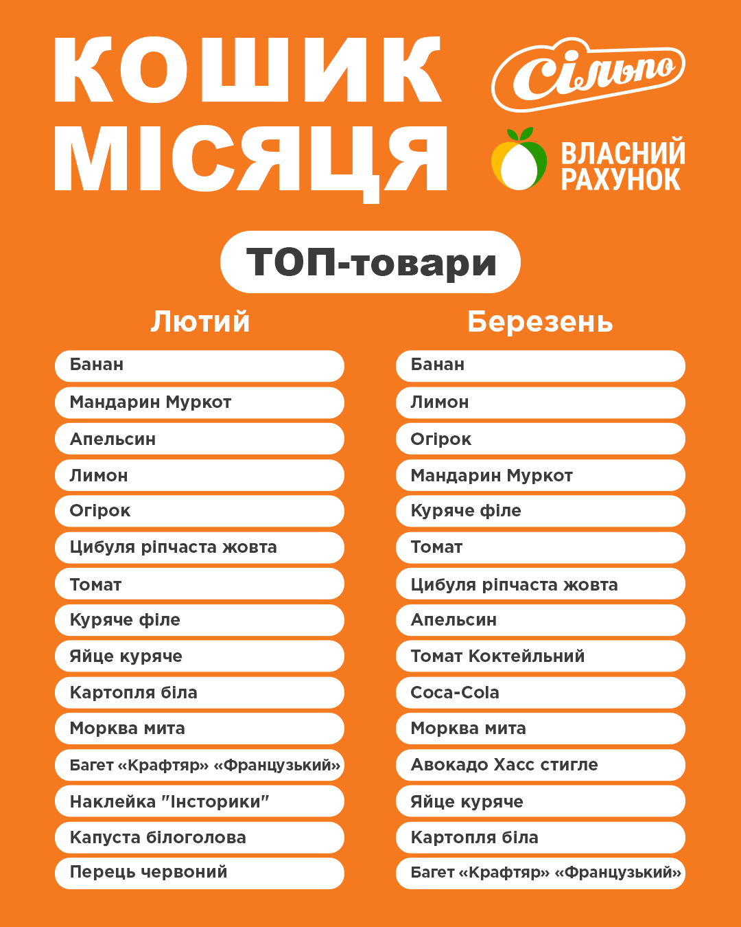 Благодаря аналитическим данным программы лояльности «Собственный Счет», выяснилось, что украинцы больше покупают овощи и фрукты. Одиннадцать из пятнадцати самых популярных товаров луны – это бананы, лимоны, мандарины, томаты, огурцы и другие овощи и фрукты. Также традиционно популярны среди покупателей Сільпо остаются товары массового потребления – куриное филе, сладкая вода, яйца и французский багет “Крафтяр”.