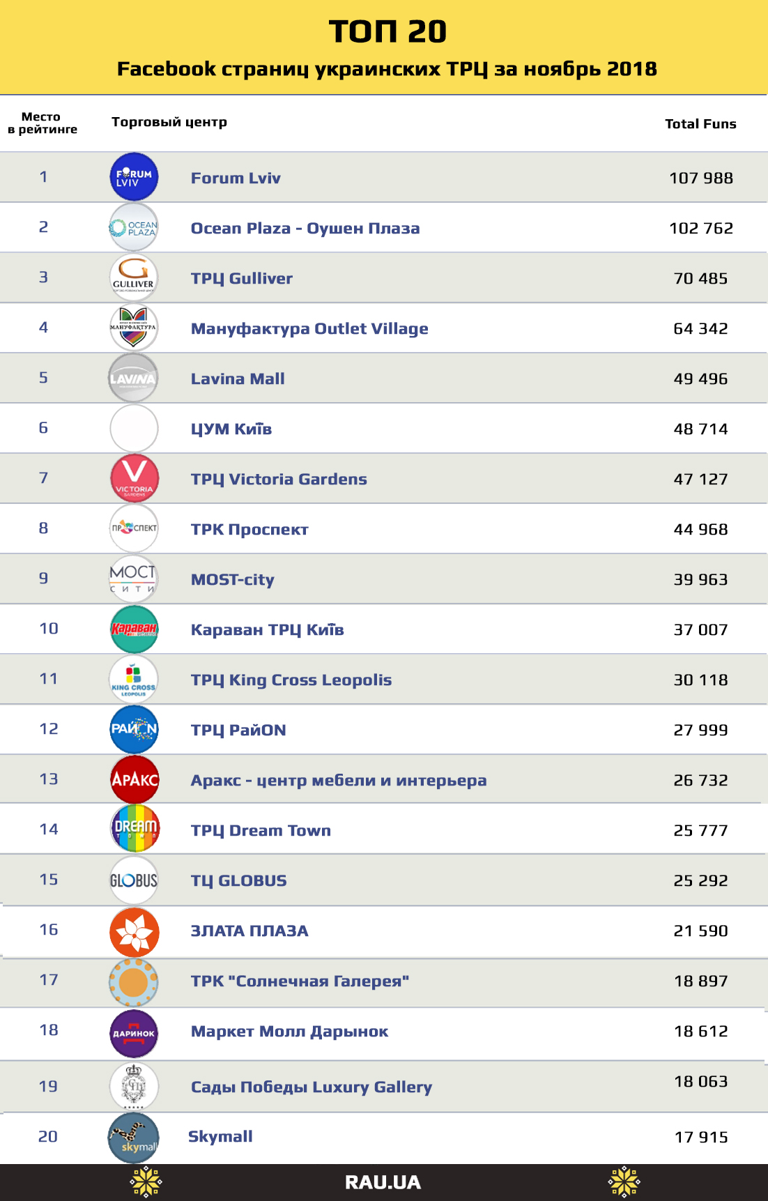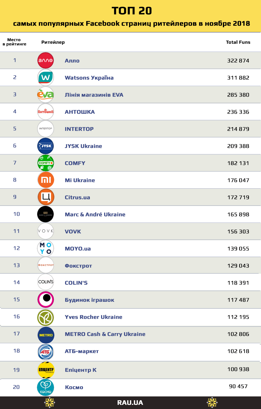 Топ-20 Facebook-страниц украинских ритейлеров и ТРЦ за ноябрь