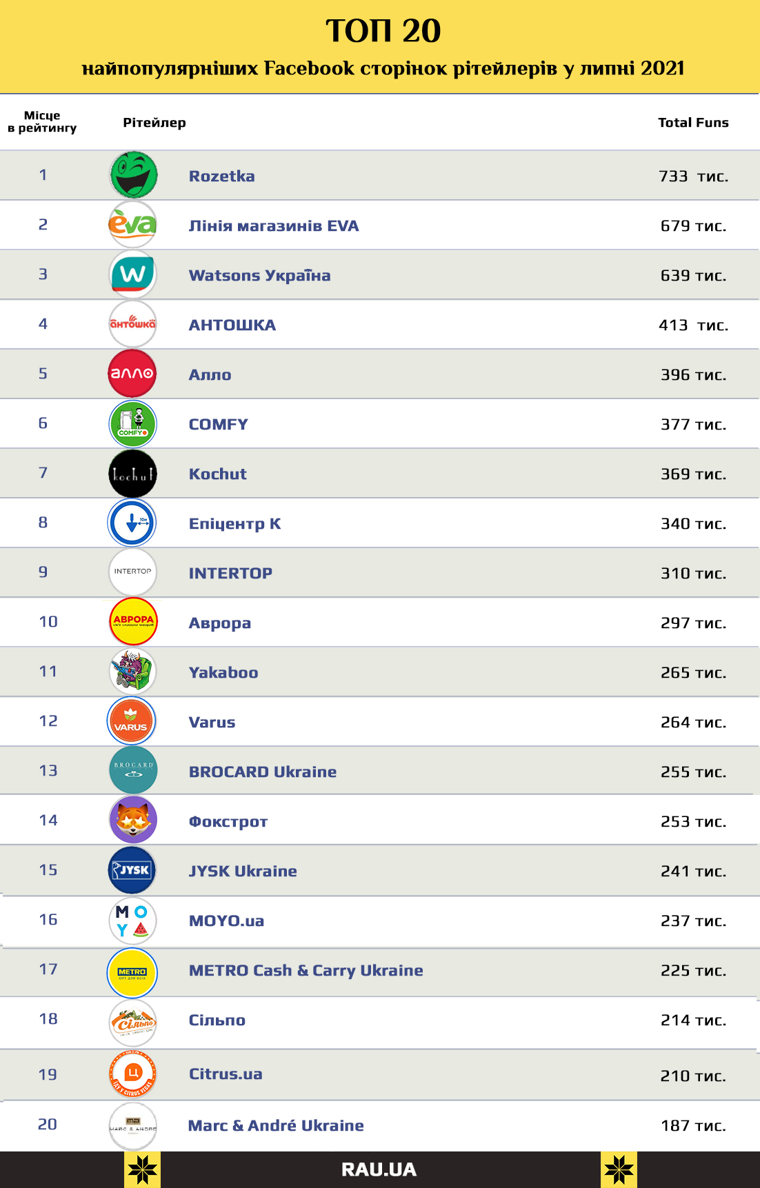 Представляем рейтинг ритейлеров, которые собрали наибольшее количество поклонников в самых популярных соцсетях мира. RAU анализировала страницы методом выборки наиболее крупных и известных розничных игроков, а также тех, кто представлен в рейтинге Facebook согласно аналитического сервиса Socialbakers. Если по каким-то причинам ваша страница не попала в финальный топ, пишите нам на e-mail – news@rau.ua.