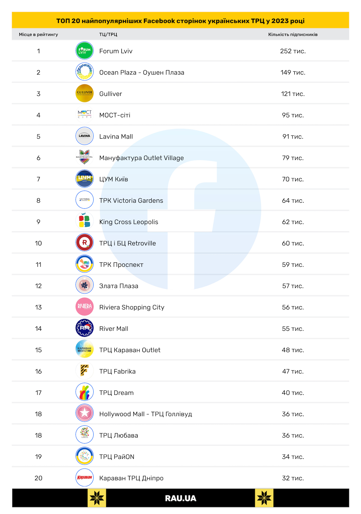 Как уже отмечалось, в этом году все ТРЦ активно работали в своих онлайн-коммуникациях, поэтому подавляющее большинство игроков увеличили свою аудиторию в Facebook. Неизменным лидером рейтинга остается львовский ТРЦ Forum Lviv – за год количество его подписчиков выросло на 14 000. Второе место снова занимает столичный Ocean Plaza, увеличив за 2023-й круг своих фолловеров на 6000. Замыкает тройку лидеров ТРЦ Gulliver с 121 000 поклонников. В общем первая семерка осталась неизменной. А вот на восьмом месте произошла ротация – ТРЦ Retroville поменялся местами с львовским ТРЦ Victoria Gardens, который увеличил количество подписчиков на 6000 и, в результате, поднялся на две позиции.