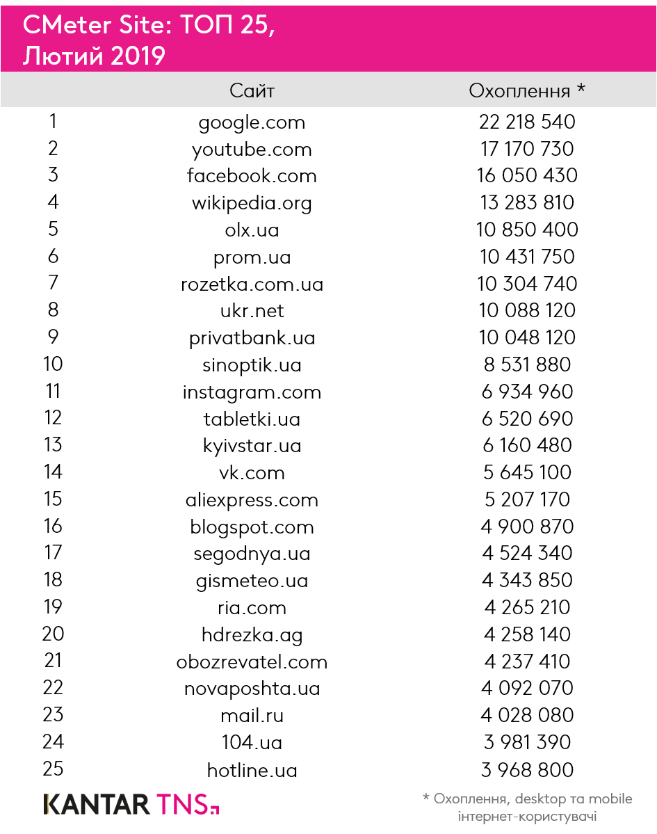 Февральские рокировки в топ-25 сайтов UAnet: минус Аllo, проседание Rozetka, рост OLX и Prom.ua