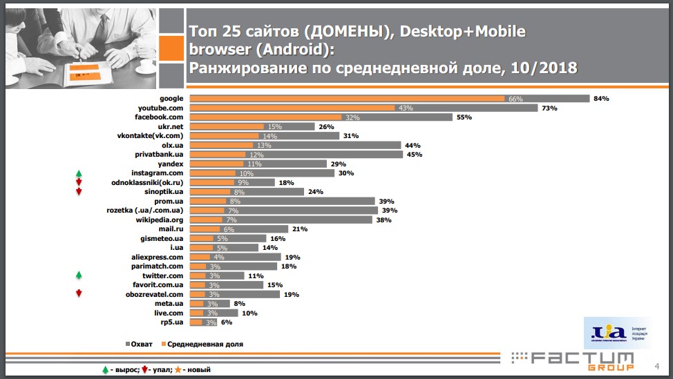 Как пишет AIN, в рейтинге сайты ранжируются по показателю среднедневной доли (СДД – среднее значение дневной доли аудитории за месяц) — учитываются показатели как на десктопе, так и мобайле. По данным Factum Group Ukraine, топ-25 по среднедневной доле (среднее значение дневной доли аудитории за месяц) на 6-м месте находится OLX, на 12-м — Prom.ua, за ним c очень небольшим отставанием идет Rozetka.