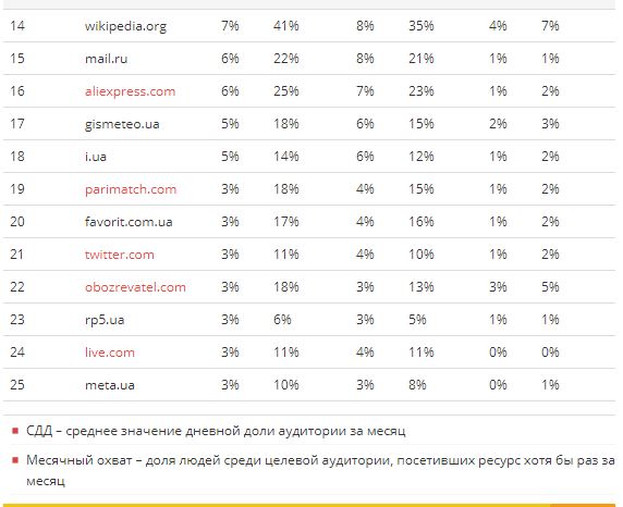 По данным Factum Group Ukraine, топ-25 по среднедневной доле (среднее значение дневной доли аудитории за месяц) на 6-м месте все так же находится OLX, на 12-м — Prom.ua, за ним c очень небольшим отставанием идет Rozetka.