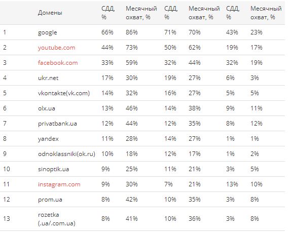 Компания Factum Group по заказу Интернет Ассоциации Украины (ИНАУ) провела исследования популярности сайтов среди украинских интернет-пользователей в ноябре 2018 года. Статистика приведена для пользователей desktop и браузеров Android, пишет blog.uamaster.com – блог интернет-агентства UaMaster.