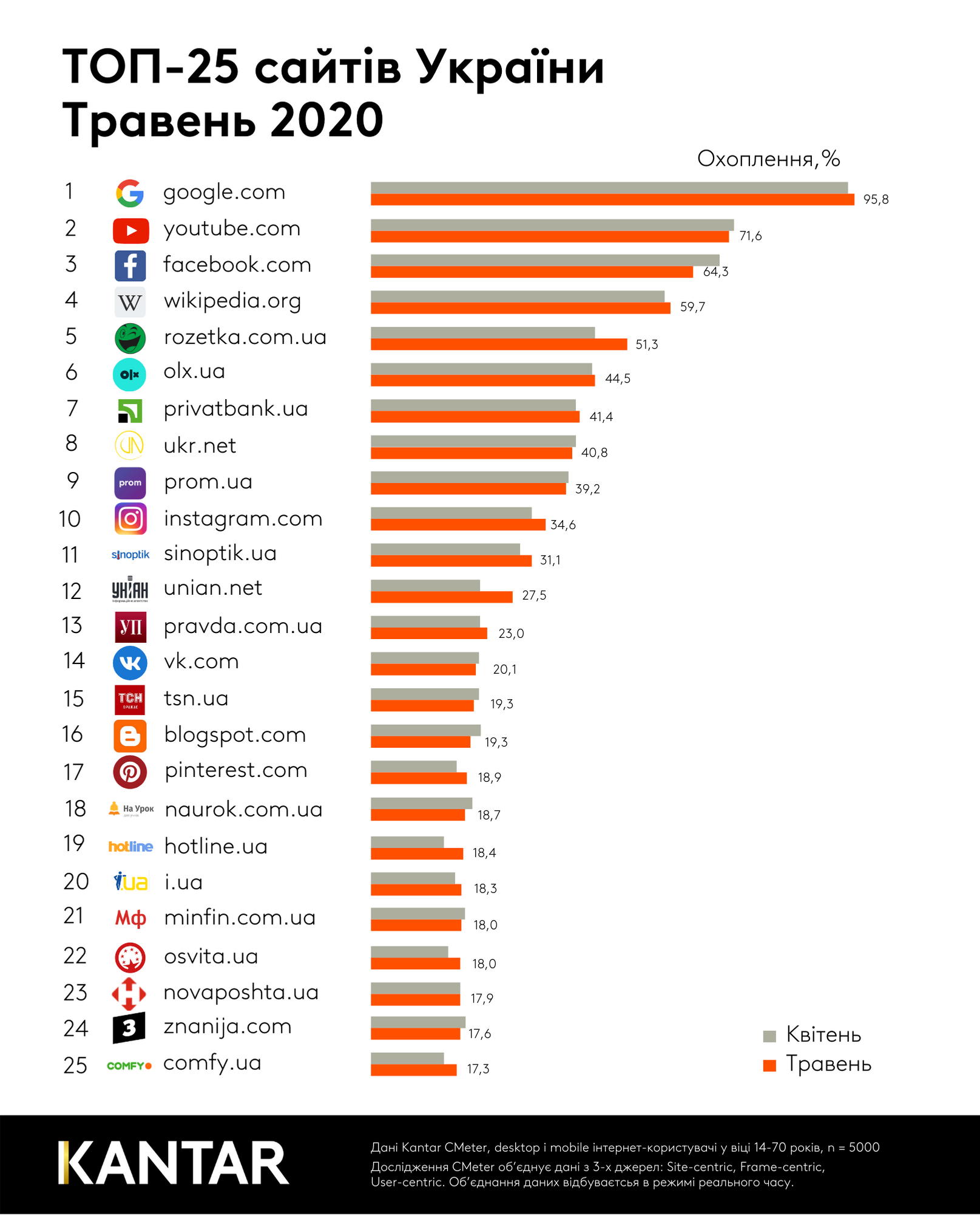 Исследовательская компания TNS Ukraine представила рейтинг самых популярных сайтов UAnet за май 2020 года. Как свидетельствуют данные рейтинга Kantar CMeter, в мае наблюдалось усиленное посещение украинцами интернет-магазинов и маркетплейсов. Это позволило Rozetka.com.ua, Hotline.ua, Comfy.ua увеличить свои охваты аудитории. Так, Rozetka снова в пятерке лидеров, а следом за ней идет olx.ua. В первую десятку также вошел prom.ua, а замыкает рейтинг сайт ритейлера comfy.ua