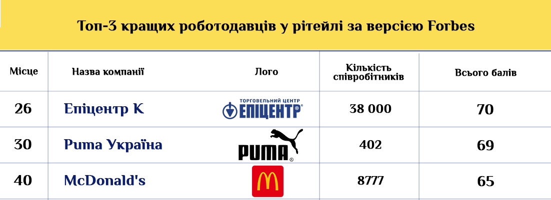 Как отмечают в Forbes Ukraine, в новом рейтинге лучших работодателей Украины 31 компания сохранила место в топ-50, в том числе шесть – в топ-10. Ритейлеры находятся во втором и третьем десятках. В частности, 26-е место заняла компания Эпицентр К, развивающая сеть ТЦ Эпицентр. Следом идет Puma Украина – известный международный спортивный бренд занял 30 место, набрав почти столько же баллов, сколько и Эпицентр. Замыкает тройку лучших работодателей среди ритейла сеть ресторанов McDonald’s, занявшая 40-е место с результатом в 65 баллов.