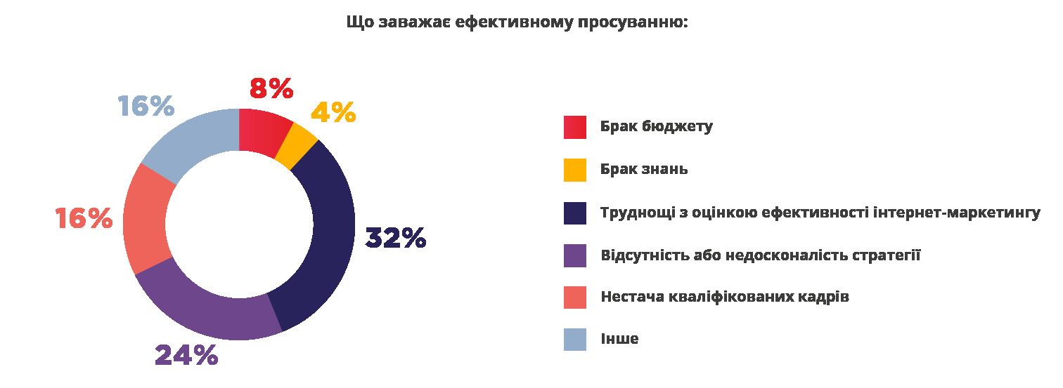 Интернет-маркетинг до сих пор является вызовом для большинства компаний. Около 32% респондентов жалуются на трудности, связанные с оценкой его эффективности, еще 24% отмечают отсутствие или несовершенство стратегии, 16% отметили отсутствие квалифицированных кадров.