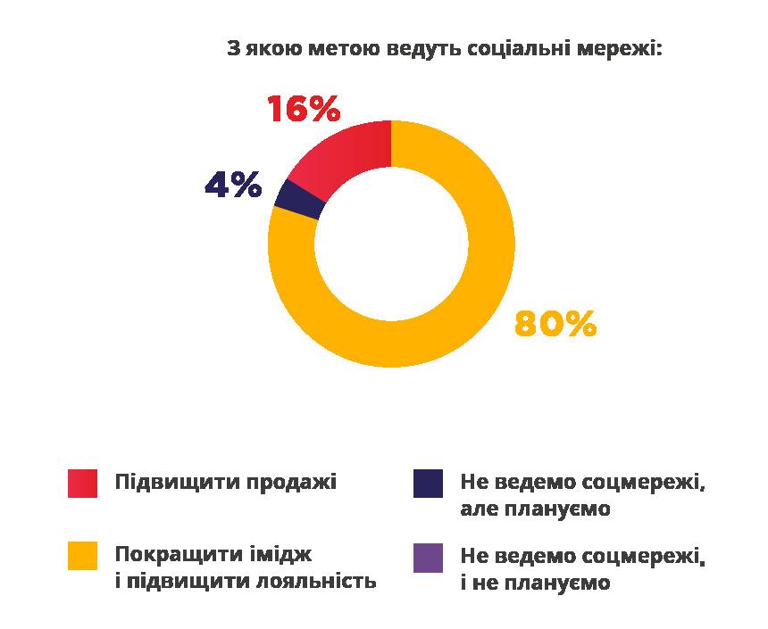 В целом, большинство компаний, принявших участие в опросе (80%), ведут свои аккаунты в соцсетях с целью улучшить имидж бренда и повысить лояльность аудитории, и только 16% – ради повышения продаж.