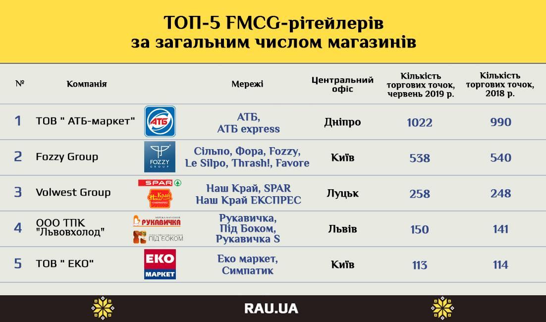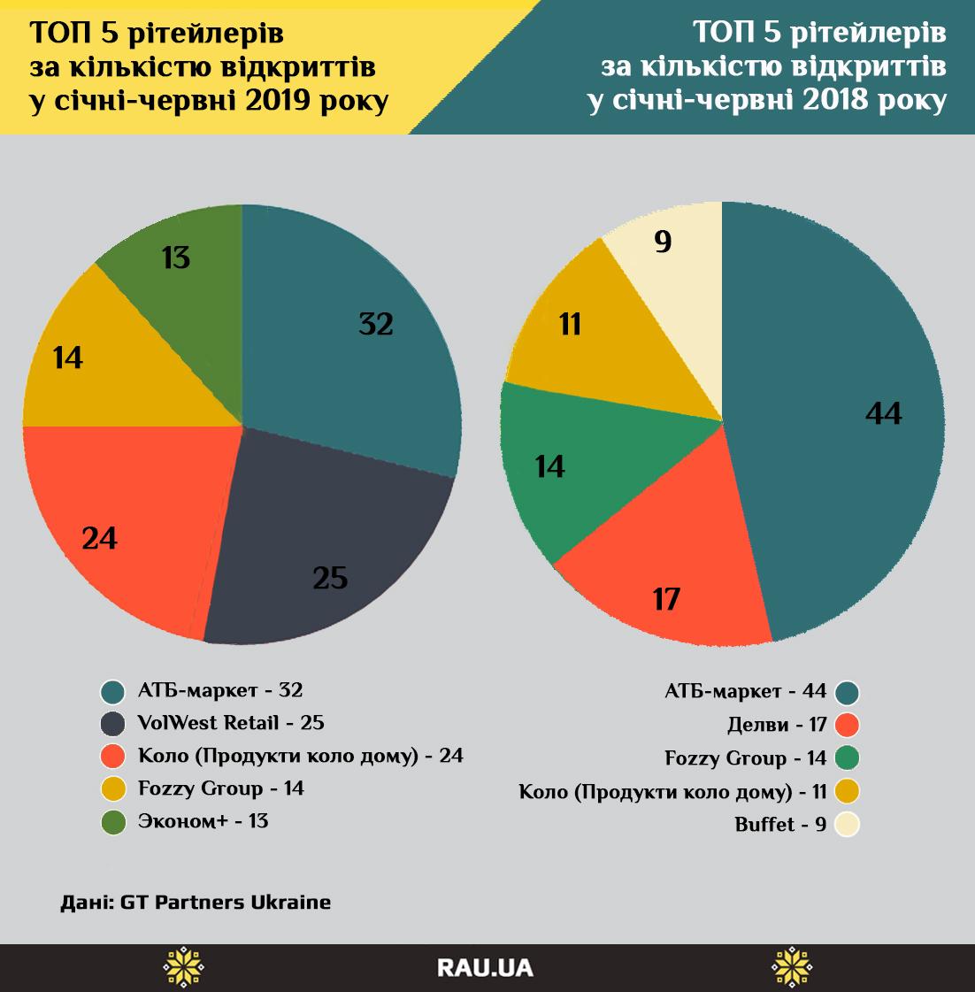Стоит отметить, что по сравнению с аналогичным отчетом годичной давности каких-либо глобальных потрясений и пертурбаций среди топ-5 игроков рынка не произошло: «на манеже все те же». Лидеры уверенно сохраняют, а то и наращивают, отрыв, но «команды средней группы» не собираются отставать и так же активно открывают новые магазины. В целом первая пятерка продуктовых операторов Украины по количеству магазинов по сравнению с I полугодием 2018-го не поменялась: АТБ, Fozzy, Volwest Group, Рукавичка, ЭКО маркет.