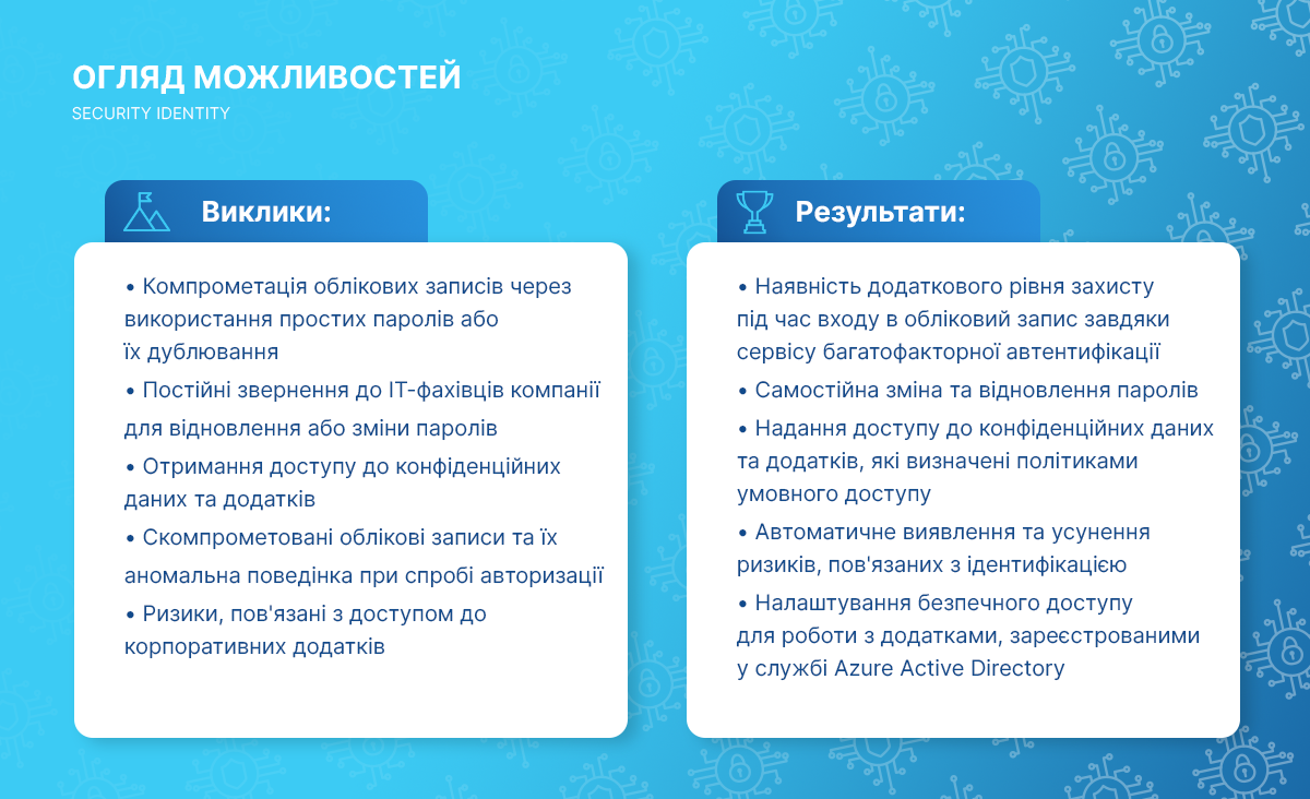 IT-безопасность любой компании начинается с идентификации пользователя и авторизации надлежащих доступов и прав. Поэтому базовая защита Microsoft Security предполагает использование сервисов Security Identity. Это комплексное решение для управления идентификацией и предоставления соответствующих уровней доступа к корпоративным данным и приложениям.