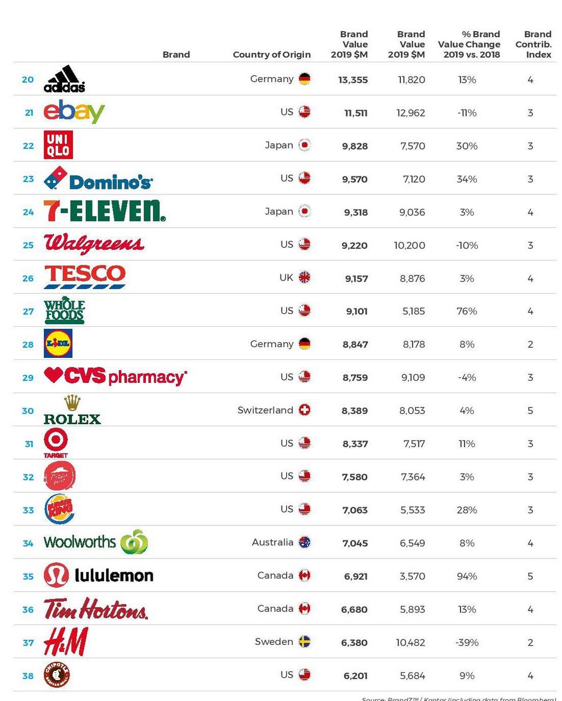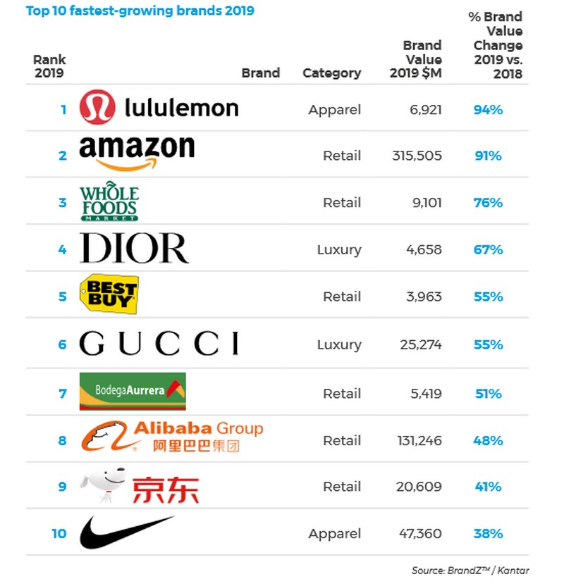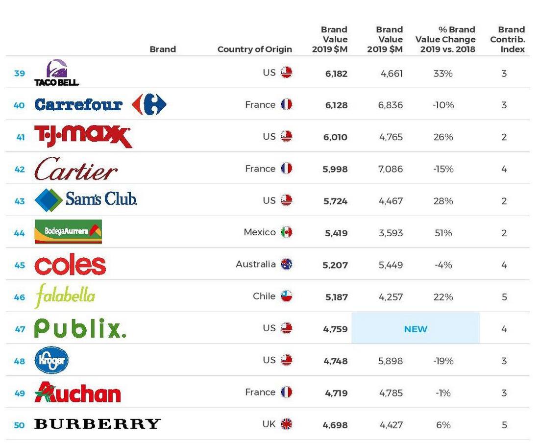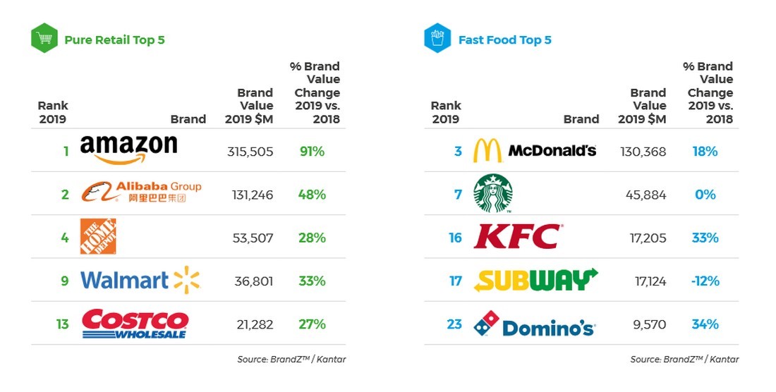 Amazon, IKEA (номер 15) и Aldi (номер 19) продолжают увеличивать ценность своих брендов в 2019 году, предлагая товары по низким ценам, создавая сильный бренд и предлагая отличный покупательский опыт.