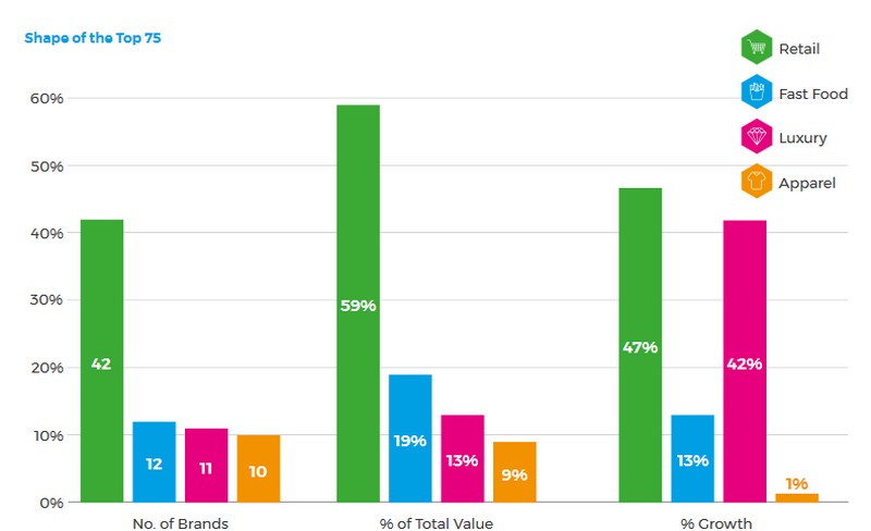 Традиционный ритейл и интернет-площадки сохраняют лидирующие позиции по всем показателям. Так, на эти виды компаний приходится почти 60% стоимости 75 самых дорогих брендов ритейла в мире. Это втрое больше, чем следующая по “ценности” брендов категория фаст-фуда.