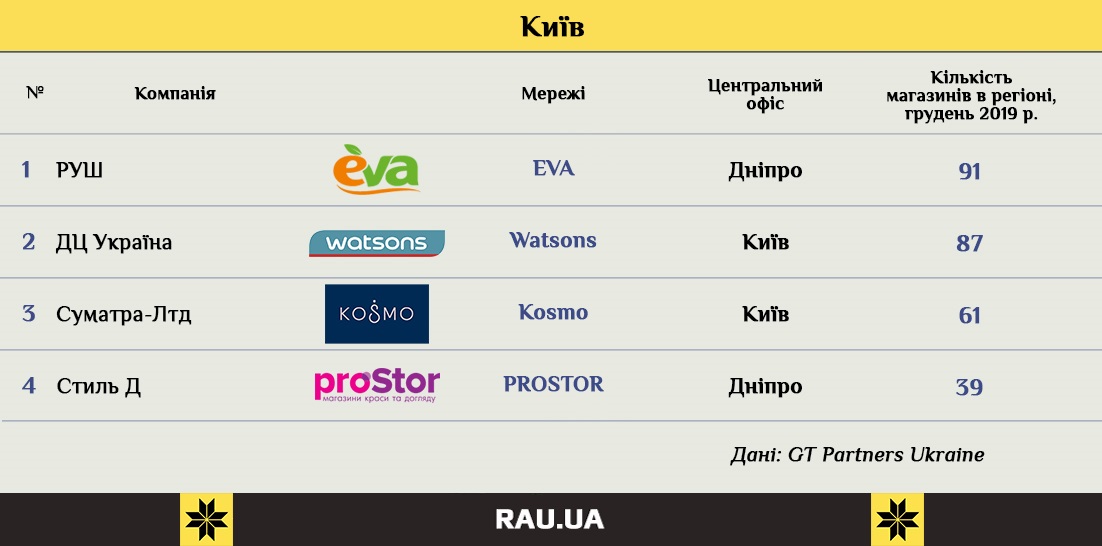 В самом платежеспособном регионе страны – столице Украины – широко представлены четыре крупных игрока: EVA, Watsons, Prostor и Kosmo. Так сложилось, что киевский рынок поделили между собой две столичные компании и два ритейлера из Днепра.