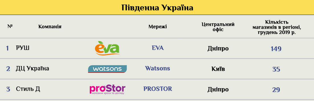 На южном направлении наиболее заметны три сети. Конкуренцию киевской Watsons и днепровской EVA составляет еще одна компания из Днепра – сеть Prostor. Этот игрок развивает сеть преимущественно на восточном и южном направлении, а также хорошо представлен в столице.