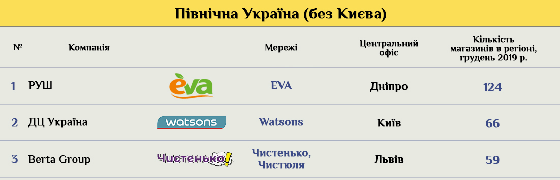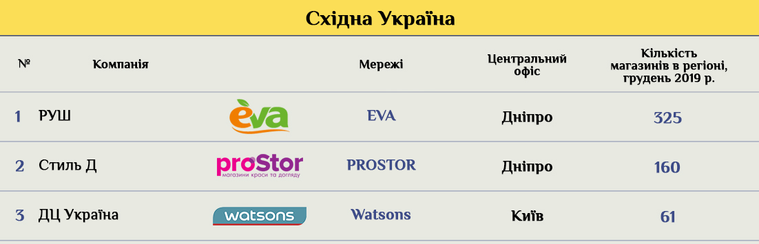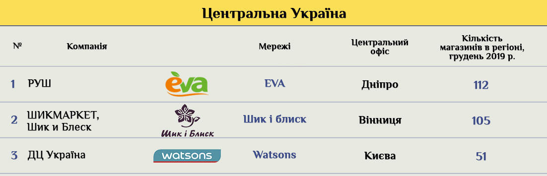 Здесь снова сошлись в борьбе за покупателя три основных игрока: из Киева, Львова и Днепра. В отличие от западной части страны, здесь локальный игрок – магазины бытовой химии Чистенько львовской Berta Group – только на третьем месте с 59-ю торговыми точками. По сути, ритейлер из Львова, владеющий также сетью парфюмерно-косметических магазинов Імідж и продуктовых маркетов Близенько, вышел за пределы Западной Украины путем поглощения в 2019 году сети товаров для красоты и ухода за домом Чистюля, которая представлена в Житомире и области. На втором месте с небольшим отрывом в данном регионе находится сеть Watsons, а лидирует почти с двукратным перевесом EVA.