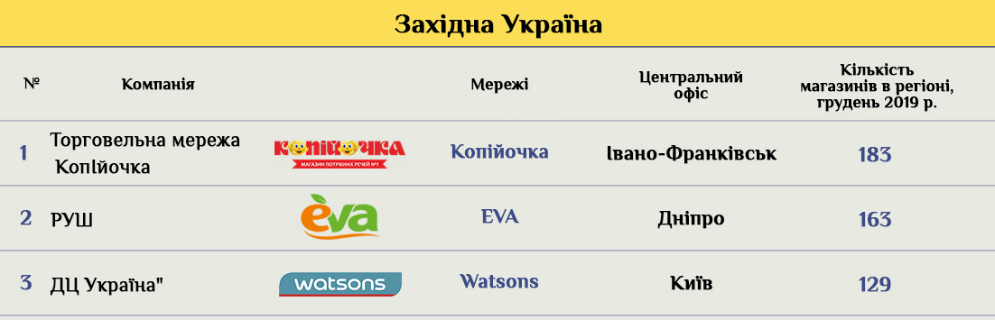 В западном регионе страны в лидерах среди drogerie-ритейлеров является местная сеть Копійочка, которая принадлежит одноименной компании из Ивано-Франковска. Это единственный регион страны, где у сети EVA из Днепра меньше магазинов – “всего” 163 против 183 у Копійочка.