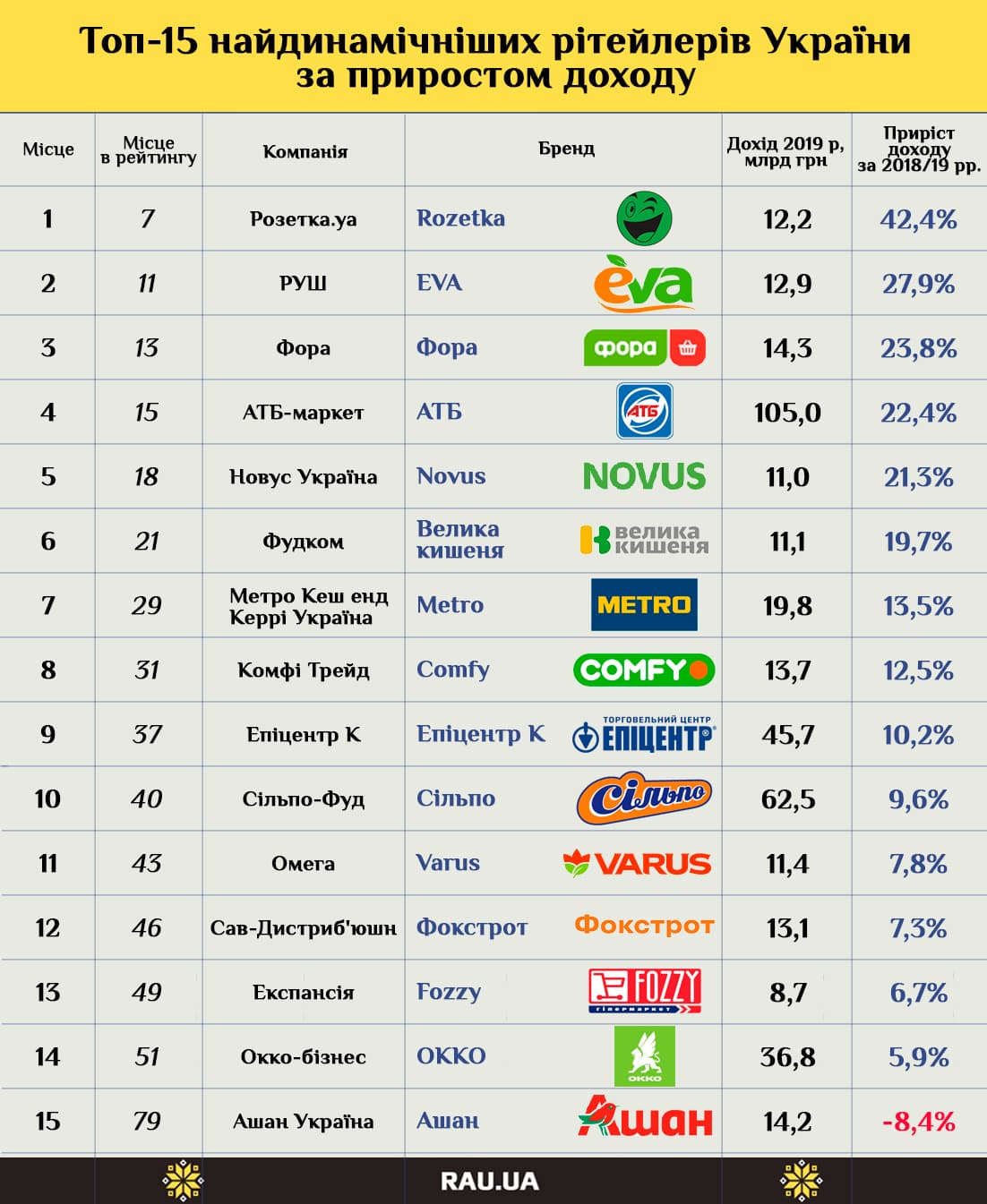 Топ-15 самых динамичных ритейлеров Украины по приросту дохода (версия НВ)