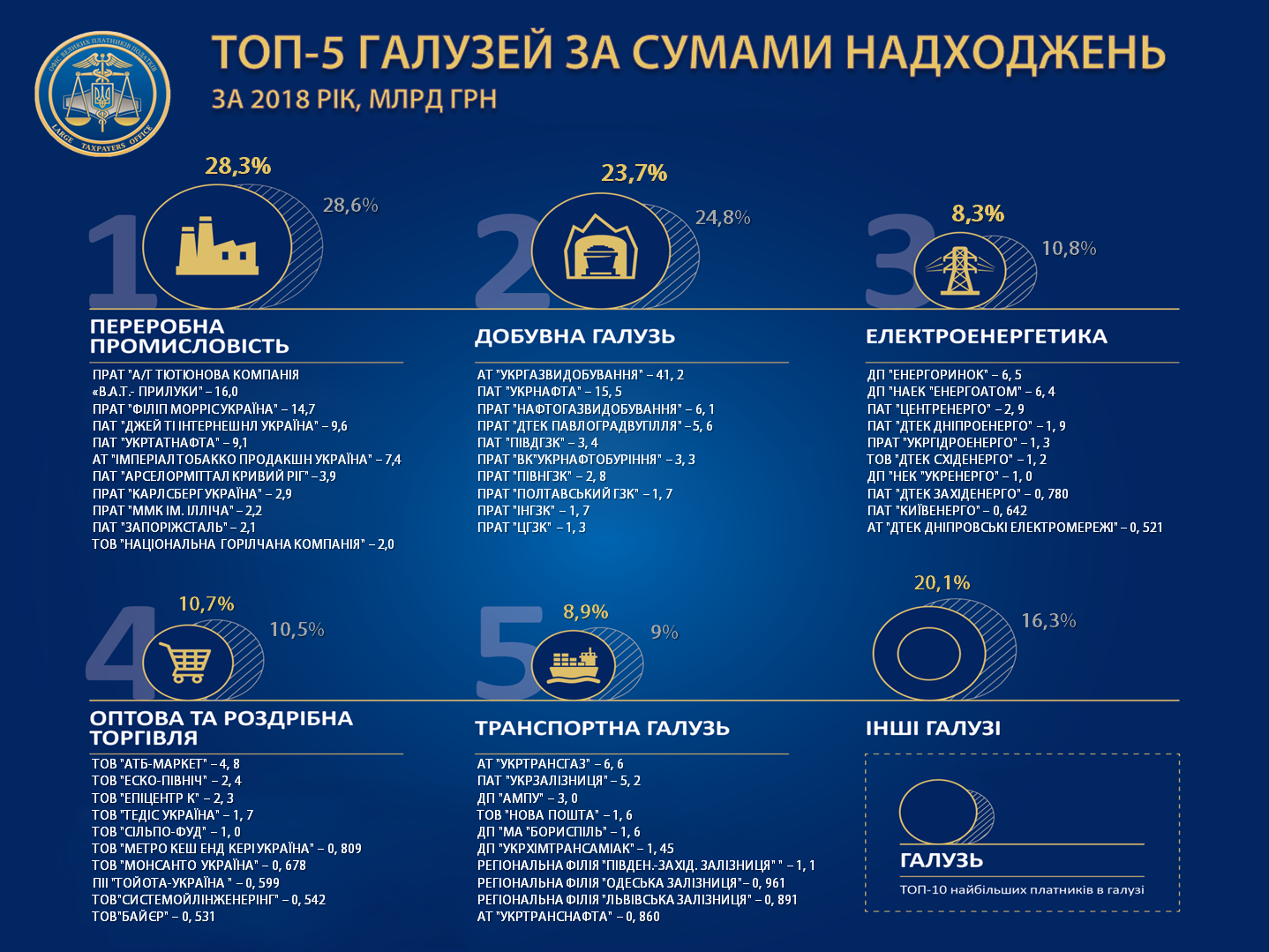 В отраслевом разрезе больше всего заплатили компании перерабатывающей промышленности, в первую очередь – производители табачных изделий. На втором месте по объему поступлений находится добывающая сфера, на третьем – электроэнергетика. Самые «щедрые» по отношению к госбюджету компании: государственные Укргазвидобування и Нафтогаз Украины.