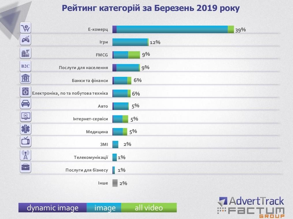 Исследовательская компания Factum Group Ukraine представила ежемесячный анализ активности украинских рекламодателей в сети интернет. Если брать все категории, то бесспорное лидерство удерживают компании сегмента розничной торговли и e-commerce — 39%.