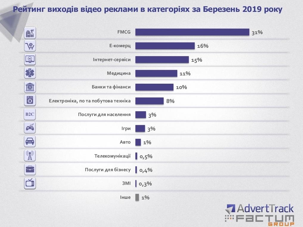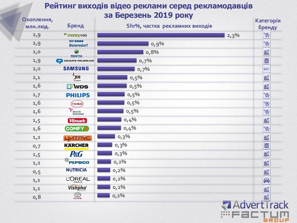 В то же время, по доле видеорекламы лидером в прошлом месяце стал финансовый сервис moneyveo. Среди ритейлеров значительная доля видеорекламы в марте пришлась на Rоzetka, Comfy и Цитрус.