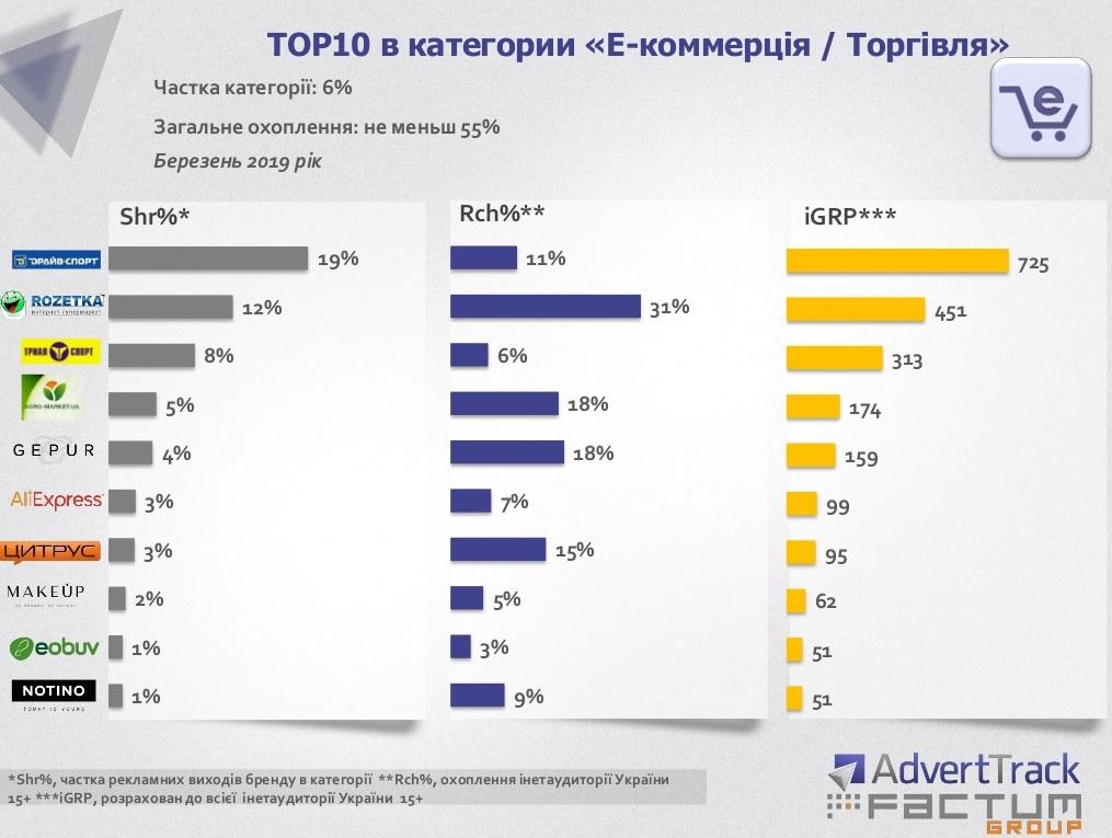 Отметим, что в десятку крупнейших рекламодателей UAnet в категории E-commerce\торговля также вошли интернет-магазины Триал Спорт, Gepur, Makeup, Aliexpress и другие.