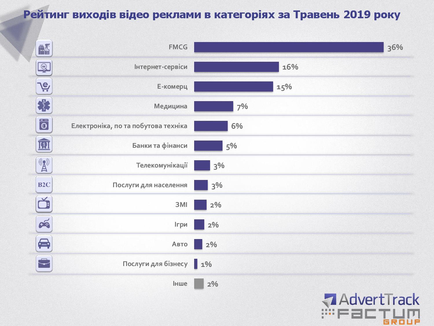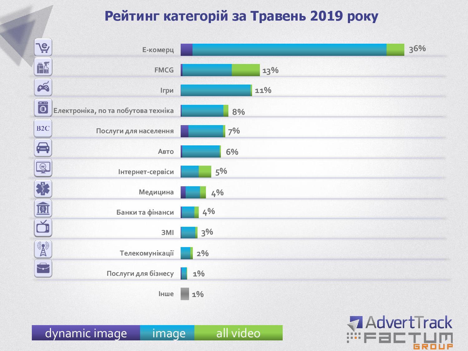Исследовательская компания Factum Group Ukraine представила ежемесячный анализ активности украинских рекламодателей в сети интернет. Если брать все категории, то бесспорное лидерство удерживают компании сегмента розничной торговли и e-commerce – 36%. Впрочем с марта 2019 года количество медийной интернет-рекламы в этой категории снизилось на 3%.