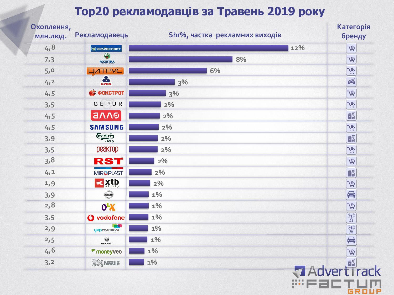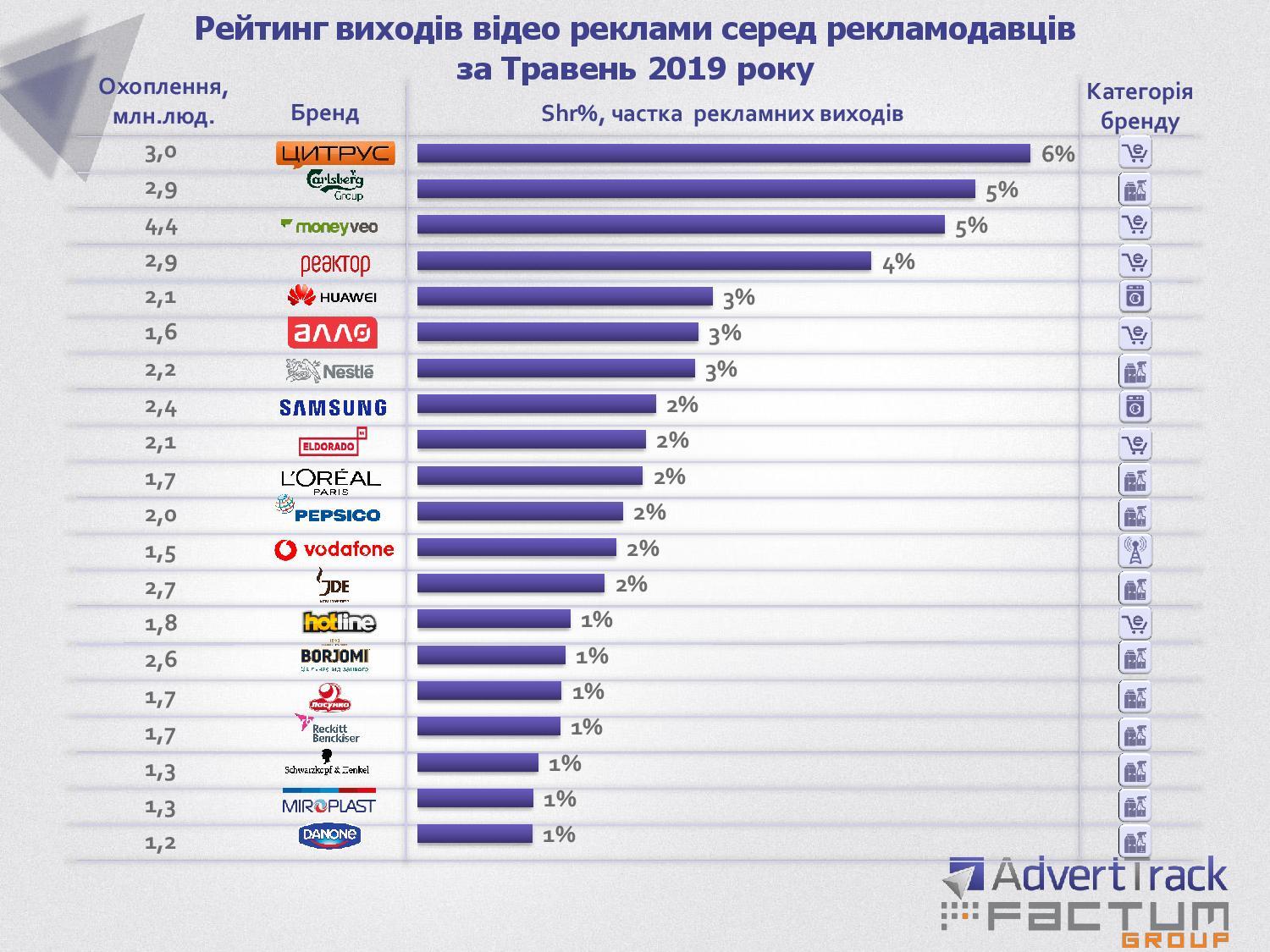 В пятерку рекламодателей среди компаний входит трое ритейлеров – Rozetka, Цитрус и Фокстрот. Что интересно, даже в топ-10 среди компаний, которые так или иначе относятся к розничной торговле, только те, что связаны с продажей техники и электроники. Седьмое и восьмое место рейтинга рекламодателей за май 2019 года заняли Алло и Samsung.