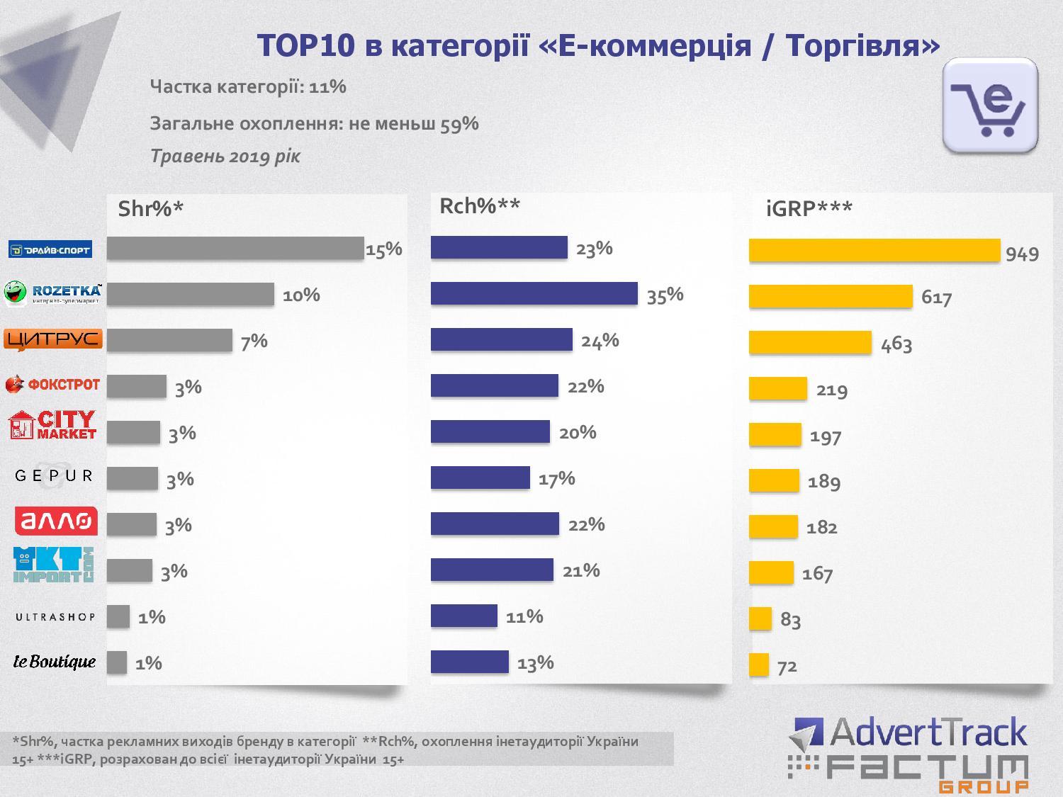 В десятку крупнейших рекламодателей UAnet в категории E-commerce\торговля, кроме указанных выше, также вошли City Market, Gepur, Ultrashop, LeBoutique и другие.